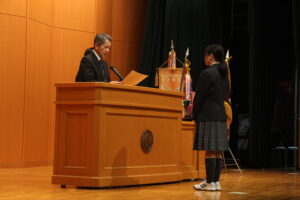 式の中では、ソフトボール部の大会やHSK中国語検定試験や実用フランス語検定をはじめとする検定試験、そして英語レシテーション大会や聖徳大学主催の体験発表会などにおいて優秀な成績を収めた生徒たちの表彰も行われました。