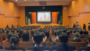 終業式では、まず語学研修(韓国)の引率中である校長先生からオンラインでお話がありました。現地から生徒たちに向けてメッセージが届けられ、2学期の締めくくりとして、気持ちを新たにする時間となりました。