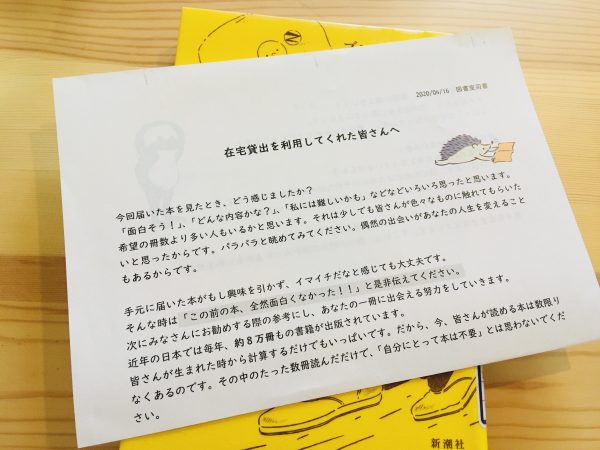 次の貸出を楽しみにしている生徒や読んだ感想をメールで届けてくれる生徒も多くおり、登校再開後も図書室がにぎわいそうな予感です。